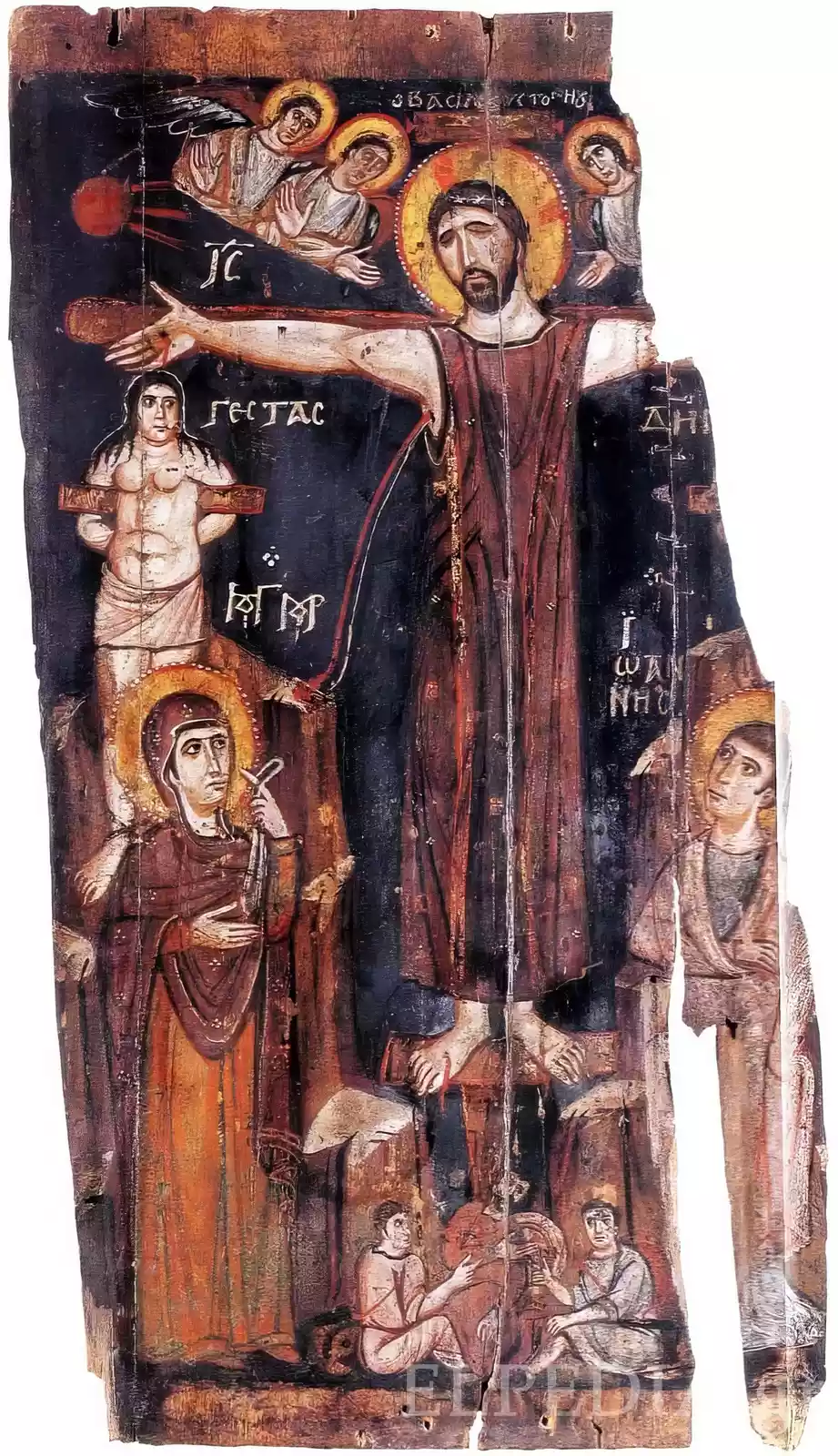 The depiction of Christ represents a moment of great significance in the history of religious art, as this icon is one of the earliest known representations of Christ dead on the cross, crowned with thorns. His body is in a virtually upright position, and is clothed in a colobium – a long garment with no sleeves, which predates the later convention of representing Christ in nothing more than a loincloth – while blood and water pour from the side that has been pierced, just as the Gospels narrate. The insights this icon affords into early Christian art illuminate the development of sacred imagery during this era of seismic shifts in philosophy and polity (Forsyth).