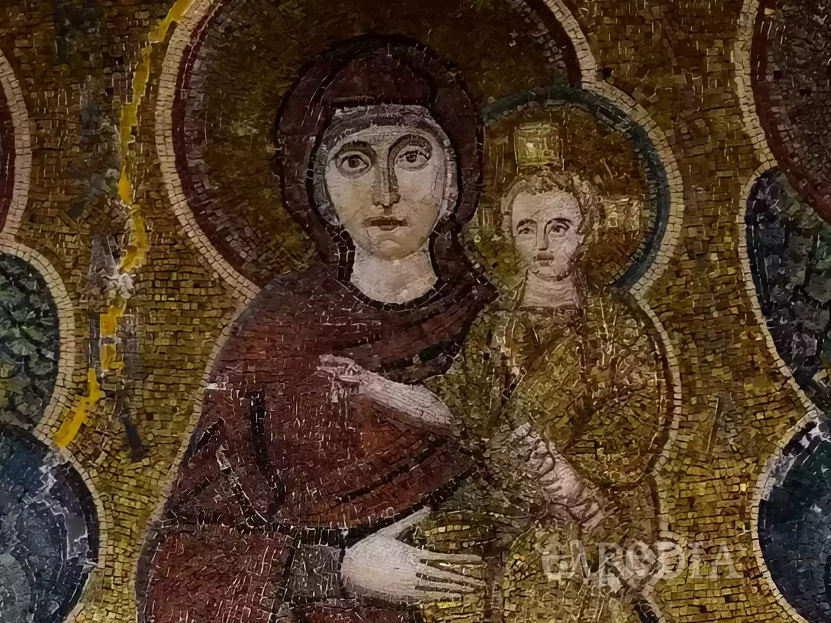 The inscription “ΑΓΙΑ ΜΑΡΙΑ” above the Virgin’s head represents a significant theological statement. M.J. Pawlowski points out that this specific title, used instead of the more common “Theotokos” (Mother of God), reflects the developing Marian doctrine of the period. The choice of this particular designation connects the mosaic to broader theological debates about the nature of Mary’s role in Christian salvation history.