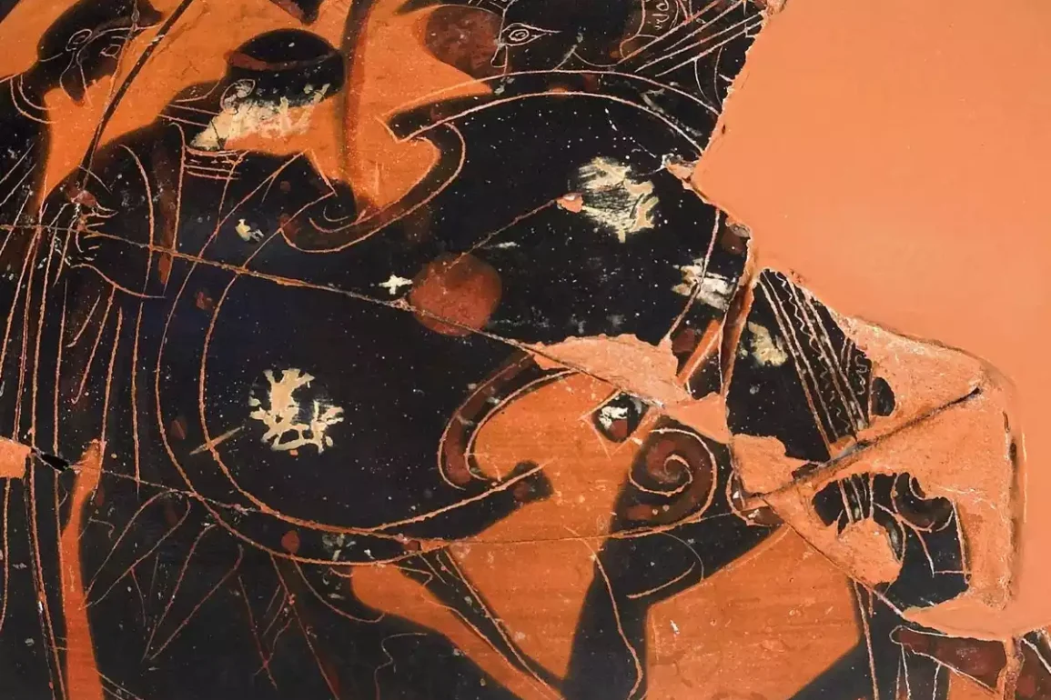 Αττικός μελανόμορφος αμφορέας, περ. 510-500 π.Χ. Ο Αίας ο Τελαμώνιος μεταφέρει το σώμα του νεκρού Αχιλλέα από το πεδίο της μάχης, του ήρωα με την τρωτή Αχίλλειο πτέρνα. Βρετανικό Μουσείο.