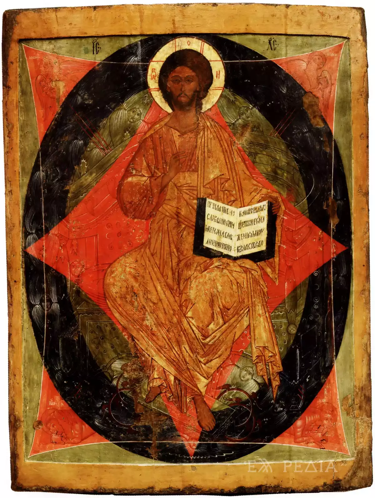 Ο Χριστός Παντοκράτωρ, ως κυρίαρχο θέμα της ορθόδοξης εικονογραφίας, αποτυπώνεται με εξαιρετική μαεστρία σε αυτή τη ρωσική εικόνα του 16ου αιώνα. Το έργο αποτελεί ένα εξαίρετο παράδειγμα της μακραίωνης παράδοσης της ρωσικής εικονογραφίας, όπου η θεολογική σημασία συνυφαίνεται αρμονικά με την καλλιτεχνική έκφραση. Η σύνθεση κυριαρχείται από την επιβλητική μορφή του Χριστού, που κάθεται σε θρόνο εντός οβάλ φωτοστέφανου (μανδόρλας), τοποθετημένου σε ένα έντονο κόκκινο ρόμβο. Η χρήση του βαθύ ερυθρού χρώματος δεν είναι τυχαία, καθώς συμβολίζει τόσο τη θεϊκή εξουσία όσο και τη θυσιαστική αγάπη. Τα χαρακτηριστικά του προσώπου του Χριστού αποδίδονται με εξαιρετική λεπτότητα, ενώ το διαπεραστικό βλέμμα Του δημιουργεί μια άμεση πνευματική σύνδεση με τον θεατή. Στο αριστερό χέρι κρατά ανοικτό ευαγγέλιο με εκκλησιαστικό σλαβονικό κείμενο, ενώ το δεξί υψώνεται σε ευλογία, δημιουργώντας μια ισχυρή διαγώνια γραμμή που οδηγεί το βλέμμα προς τα άνω.