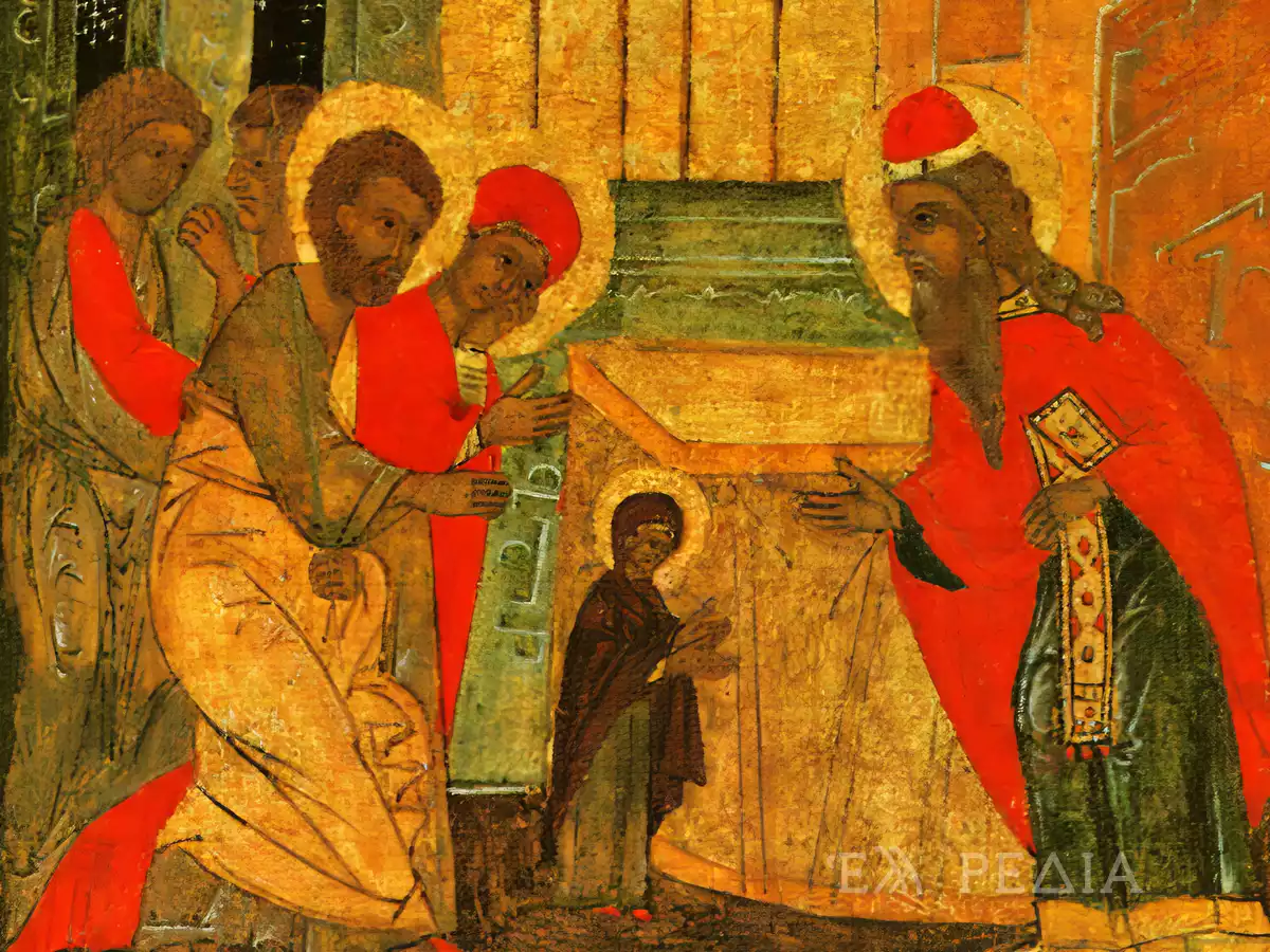 Τα Εισόδια Της Θεοτόκου Στο Σολβυτσεγκόντσκ Αποτυπώνουν Τη Στιγμή Της Εισόδου Της Τριετούς Μαρίας Στο Ναό, Συνοδευόμενη Από Τους Γονείς Της