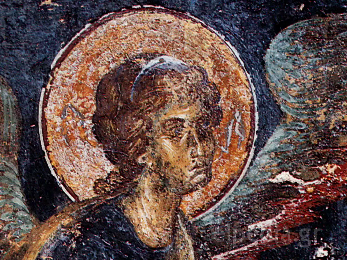 Detail of the fresco of Mystras: The Angel of Judgment, focused on reading the Book of Life, a masterpiece of Palaiologan art.