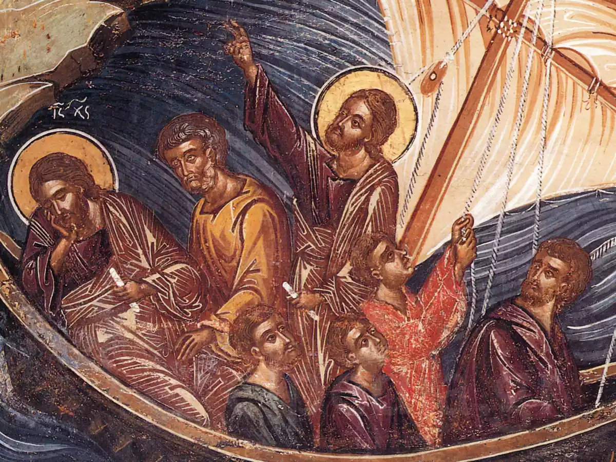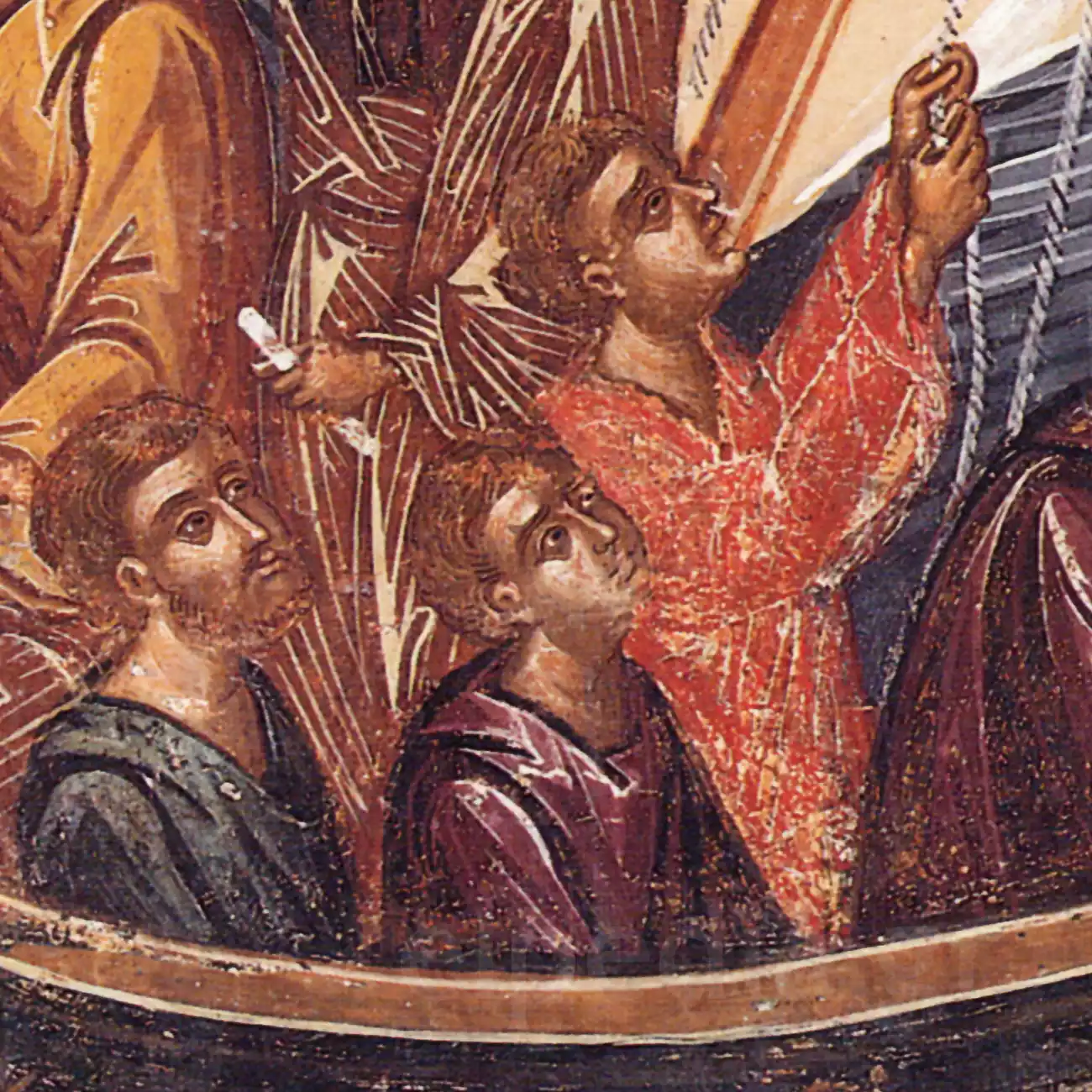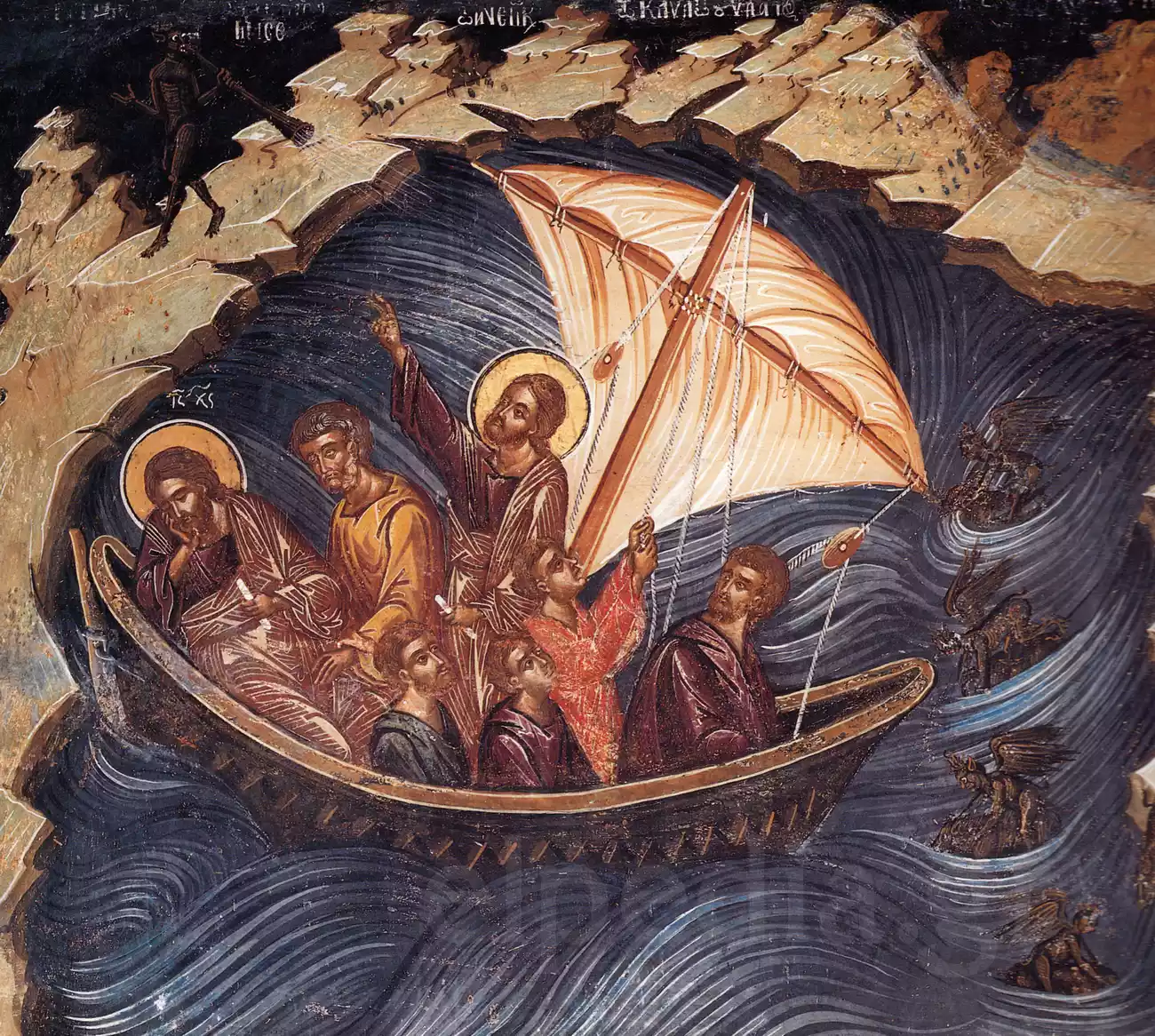 Beyond its artistic value, the fresco at the Monastery of Philanthropinon is charged with deep theological content. The central message is the revelation of the divinity of Christ and his absolute dominion over creation. The elements of nature, the wind and the sea, which instill terror in people, obey his word, proving that He is the Creator and Lord of all. The contrast between the sleeping Christ and the fury of the storm underscores the difference between divine calm and human turmoil. Christ’s sleep is not weakness but a sign of trust and control over the situation. The disciples’ reaction, characterized as “little faith” in the Gospels, highlights human weakness in fully grasping divine power, even for those closest to Christ. The miracle aims not only to save them from physical danger but primarily to strengthen their faith. The boat, amidst the storm, serves as a timeless symbol of the Church navigating through the difficulties and trials of the world, always having Christ as its helmsman, who can bring peace even in the fiercest storms. The personification of the wind as a demon adds an additional level of symbolism, presenting Christ as the victor not only over natural forces but also over the dark spiritual forces that oppose God’s plan.