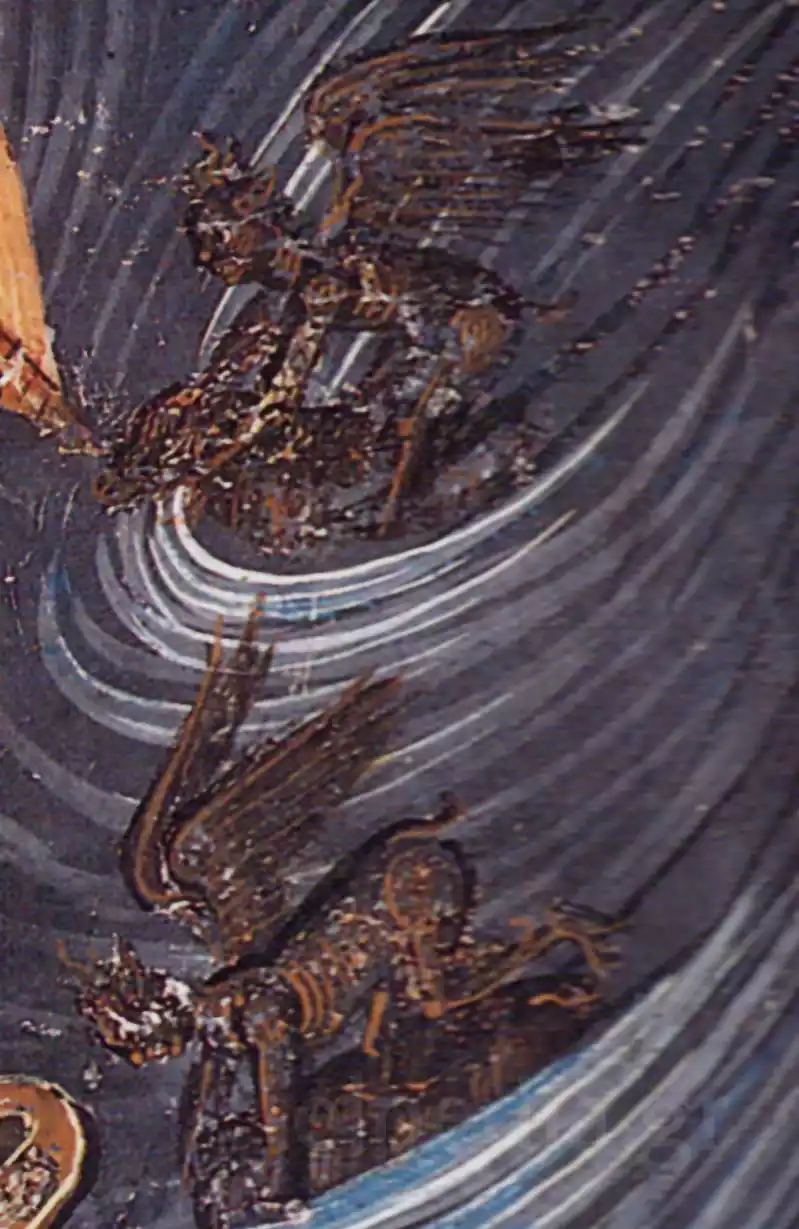 In this fresco, the wind is not merely represented as a natural phenomenon but is personified in a particularly symbolic way. It is depicted as a dark, demonic figure on the rocky shores, blowing through a long horn, directing the whirlwind towards the boat. This depiction connects the storm with the forces of evil that Christ conquers.