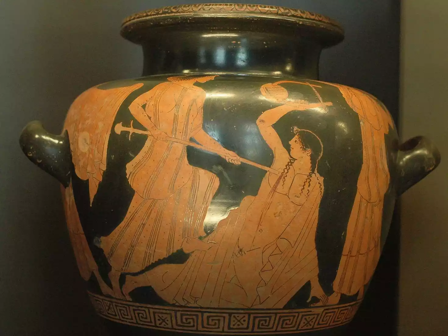 The death of Orpheus. Attic red-figure stamnos by Hermonax, ca. 470 BC. Related to the Orphic Mysteries. Louvre Museum (G 416).