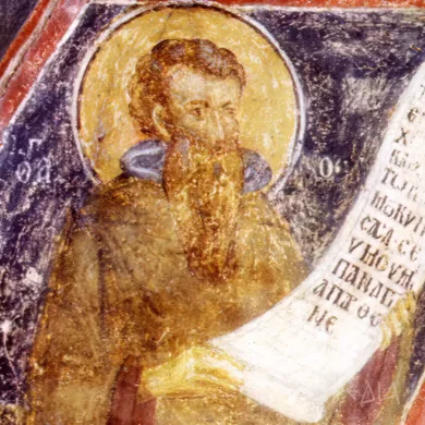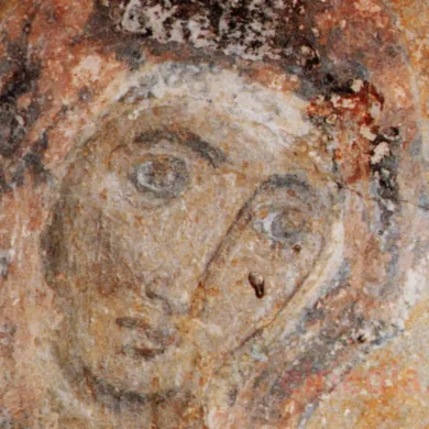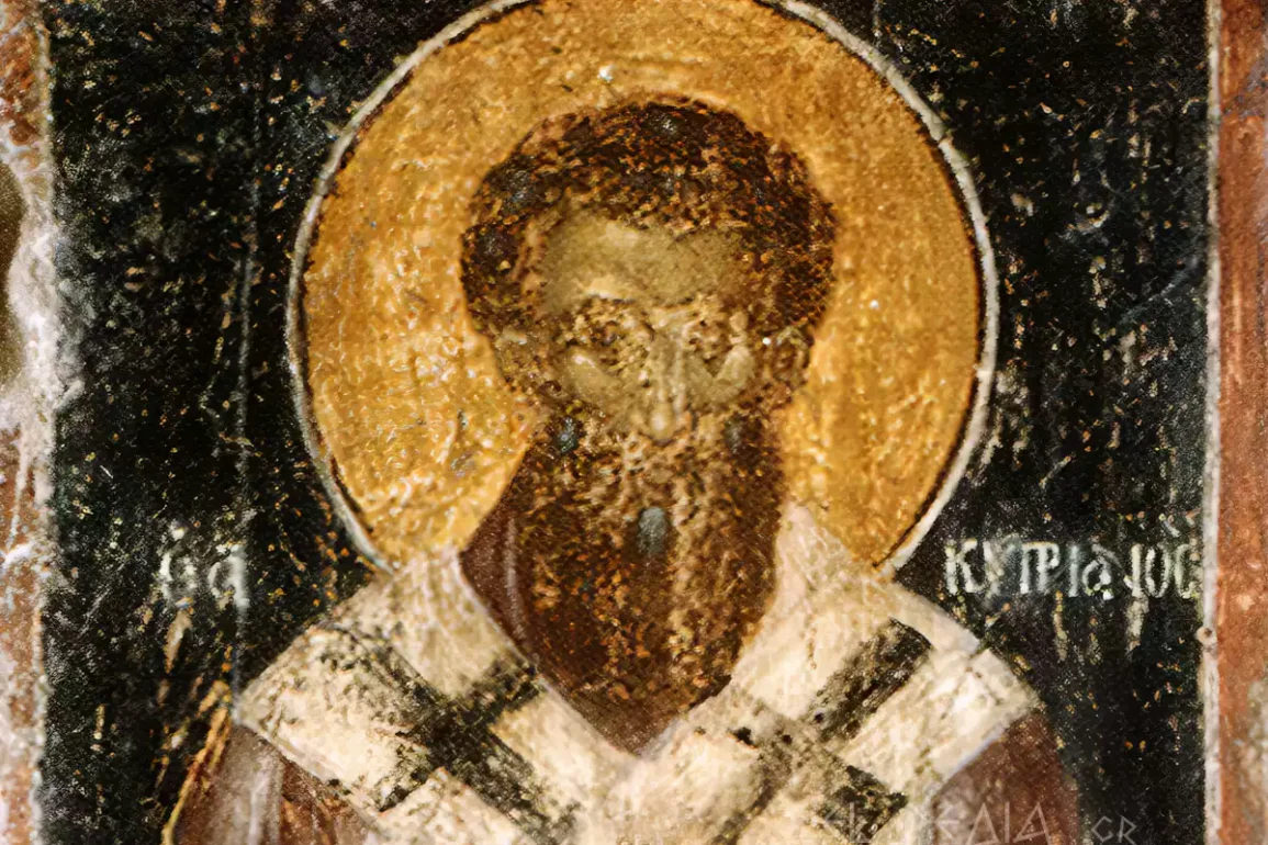 The fresco of Saint Cyprian is an excellent example of late Byzantine art from the early 15th century, adorning the walls of the Holy Monastery of Valsamonero in Crete. The work captures with unique mastery the artistic tradition of the Cretan School, combining Byzantine and Western elements. The mural is part of the broader iconographic program of the church of Panagia Odigitria, dating to the period of Venetian rule. The unknown artist has depicted Saint Cyprian in episcopal attire, holding the Gospel, reflecting his hierarchical status. The fresco is distinguished by its exceptional technical execution, detailed rendering of the clothing elements, and the intense spirituality exuded by the figure of the Saint. The art of mural painting reflects the complex cultural identity of Crete during the period of Venetian rule, where Byzantine tradition coexisted and interacted with Western influences.