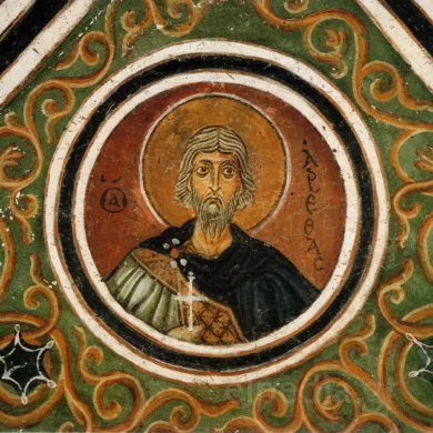 The artistic influences that shaped the iconographic program of the church reflect the complex cultural identity of medieval Crete, where Byzantine tradition meets Western artistic trends (Bayet). The decoration of the church was carried out in different phases, with the northern aisle of Panagia dating to the 14th century, while the murals of the southern aisle, including the depiction of Saint Cyprian, were executed between 1407 and 1428.