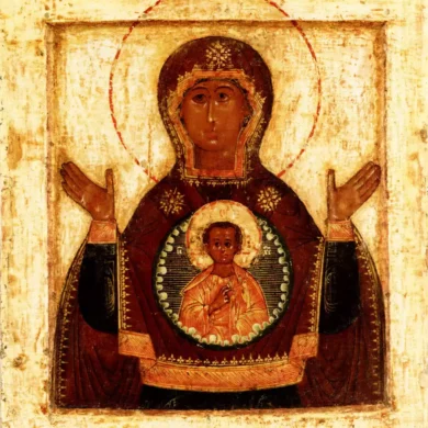The anonymous iconographer’s expert technical ability comes through not only in the masterful composition of the scene but also in the almost palpable spiritual depth of the image. Here, we see St. Mark with his characteristic lion. And though the scene is filled with a commanding presence—the powerful, wild-looking lion, calm but obviously not at rest—what we have in the image is an expression of perfect peace. The lion seems to be testifying to the calm power of the holiness that has tamed him. And somehow, in the essence of presence and in the message it delivers, this fresco captures both the power of faith and the transformative nature of divine grace.