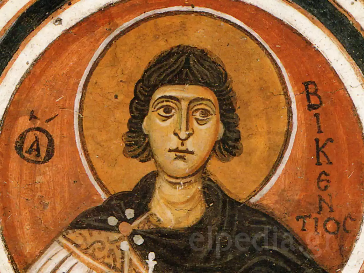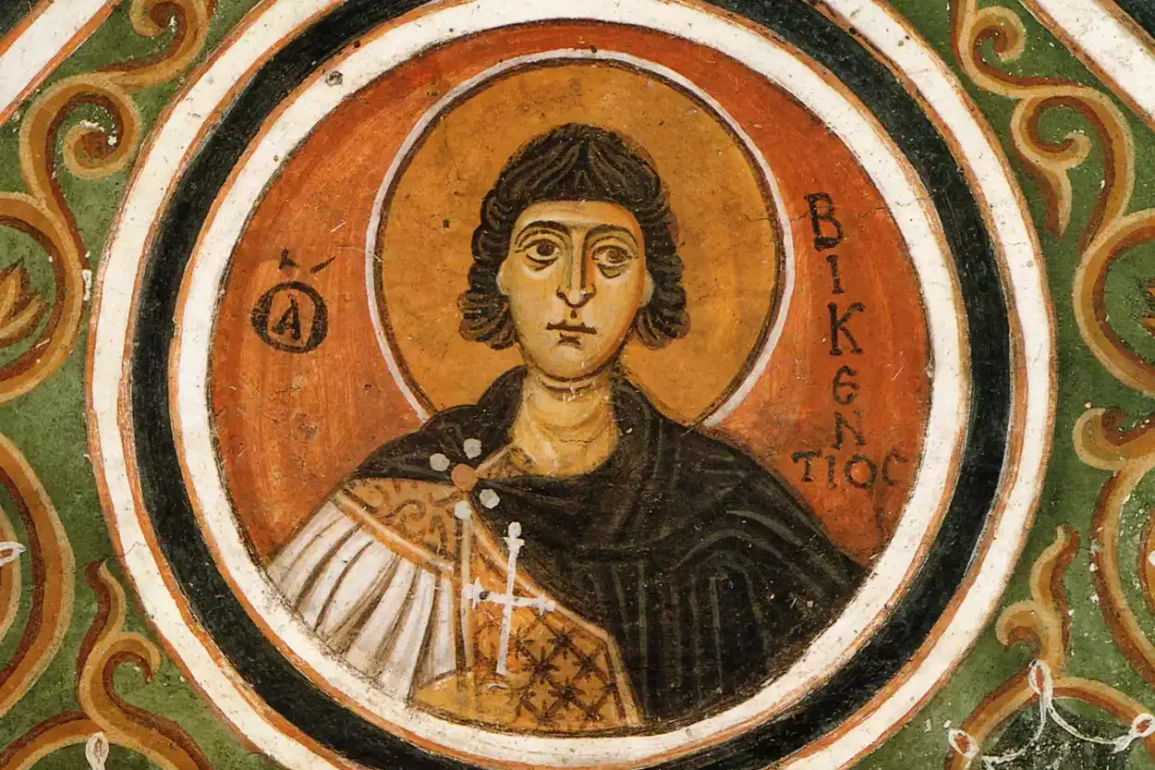 Saint Vincent was a deacon and martyr of the Christian Church from Spain, who lived in the late 3rd to early 4th century. He was martyred during the persecution of Emperor Diocletian. His depiction in the Monastery of Hosios Loukas, along with other martyrs, underscores the significance of martyrdom for faith and is part of the rich iconographic program of the monastery’s crypt.