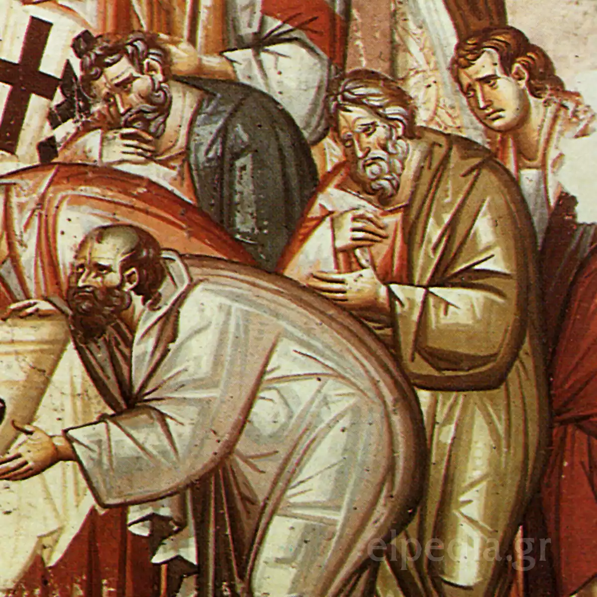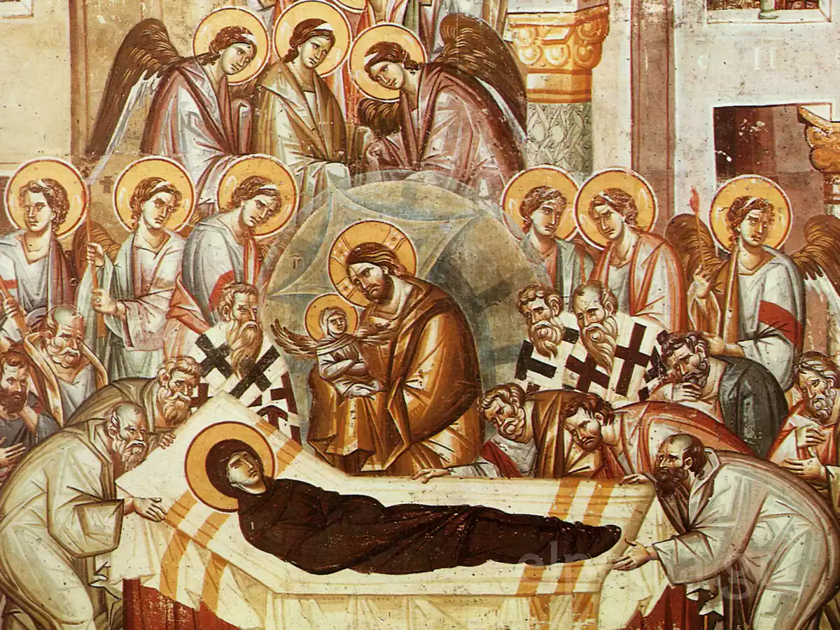 In the background of the fresco, the apostles are seen coming “from afar,” transported through clouds from the ends of the earth to attend the Dormition, while in the upper right corner, Theotokos is depicted offering her belt to the apostle Thomas who was delayed in arriving. This inclusion of different temporal moments in a single composition is characteristic of Byzantine iconography, which sought to convey the theological fullness of the event rather than a realistic chronological sequence.