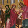 - El Niño Emmanuel: Representado dentro de la mandorla, simboliza la Luz del Mundo y la divinidad encarnada. Un nimbo crucífero, quizás con la inscripción “ΦΩΣ” (Luz), remarca su naturaleza divina.