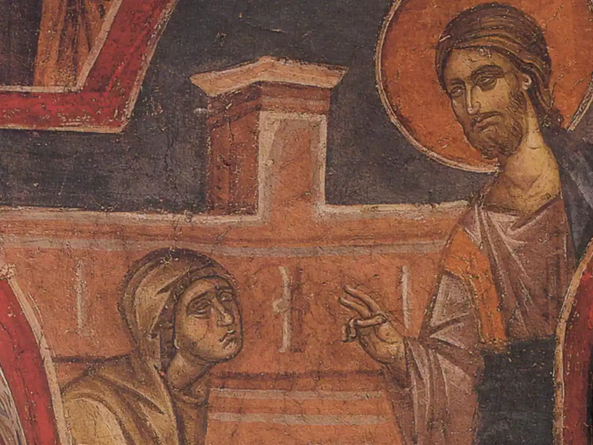 Dans le lieu sacré du Monastère de Hilandar, le centre religieux le plus important des Serbes orthodoxes au Mont Athos, se trouve l’un des ensembles de fresques les plus importants de la période Paléologue. Parmi les nombreuses compositions artistiques qui ornent le catholicon du monastère, se distingue la fresque « Le Christ Louant la Pièce de la Veuve ». Cette représentation illustre avec clarté le récit biblique des Évangiles selon Marc et Luc, où Jésus loue une pauvre veuve qui offre ses maigres économies au trésor du Temple. L’œuvre est datée de la deuxième décennie du 14ème siècle et constitue un exemple caractéristique de la soi-disant Renaissance Paléologue (Atsalos), une période de renouveau spirituel et artistique à Byzance. La fresque s’inscrit dans le vaste programme iconographique du catholicon qui comprend des scènes de la vie du Christ, des Douze Grandes Fêtes, de la Passion, des Miracles et des Paraboles, ainsi que des scènes de la vie de la Vierge.