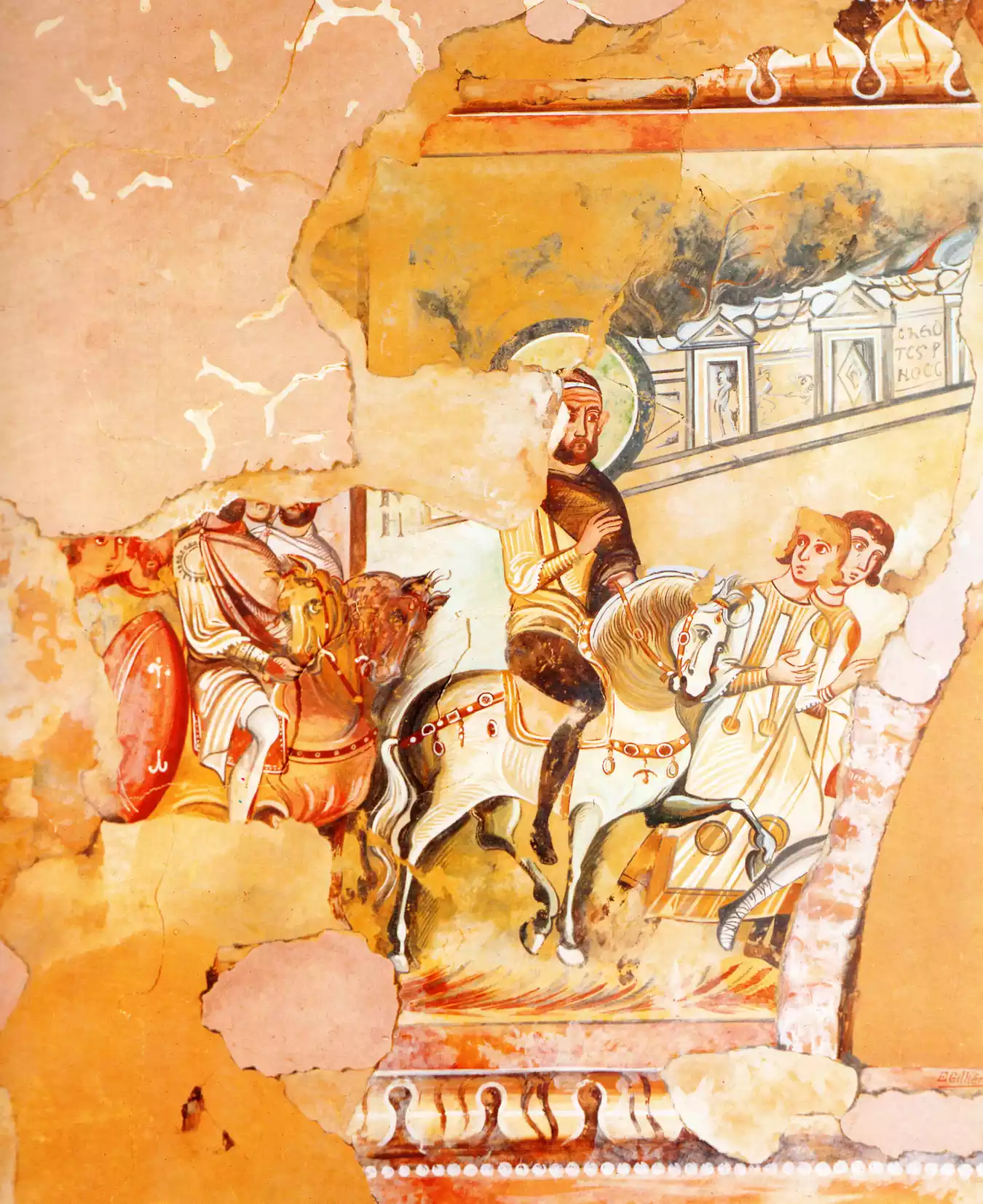 Η παρουσία του ναού του Αγίου Δημητρίου στην τοιχογραφία, χαρακτηριζόμενου ως “Η Αγία Εκκλησία η εν τω σταδίω”, υπογραμμίζει τον κομβικό ρόλο του πολιούχου αγίου στη θεολογική και πολιτική διάσταση της επιχείρησης. Κατά τη βυζαντινή αντίληψη, η νίκη επί των Σλάβων αποδιδόταν στη θαυματουργική επέμβαση και προστασία του Αγίου Δημητρίου, ο οποίος θεωρείτο ένθερμος υπερασπιστής της Θεσσαλονίκης. Η απεικόνιση του αγγέλου που κατέρχεται να σώσει τους πιστούς στο ιερό του ναού αντανακλά την παγιωμένη παράδοση της θείας παρέμβασης μέσω του αγίου προστάτη της πόλης. Η διασύνδεση της αυτοκρατορικής εξουσίας με την αγιολογική παράδοση συνιστά θεμελιώδες στοιχείο της πολιτικής θεολογίας του Βυζαντίου, ενισχύοντας τη νομιμοποίηση της αυτοκρατορικής παρουσίας μέσω της θείας επικύρωσης.