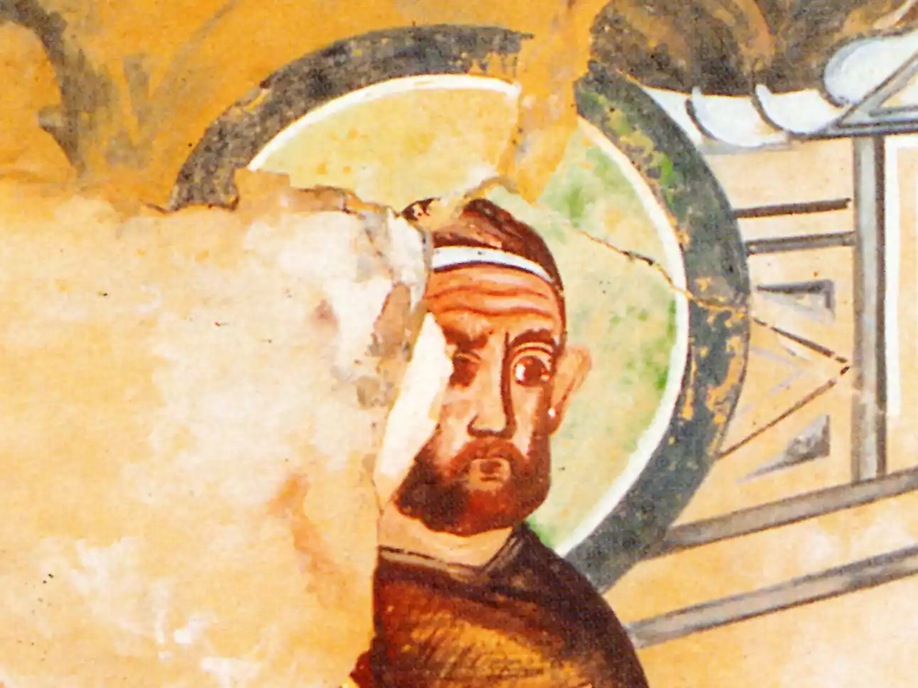 Τεχνοτροπικά στοιχεία της τοιχογραφίας του Ιουστινιανού με τις προοπτικές βραχύνσεις και τα ελληνίζοντα χαρακτηριστικά που χρονολογούν το έργο στον 7ο αιώνα.
