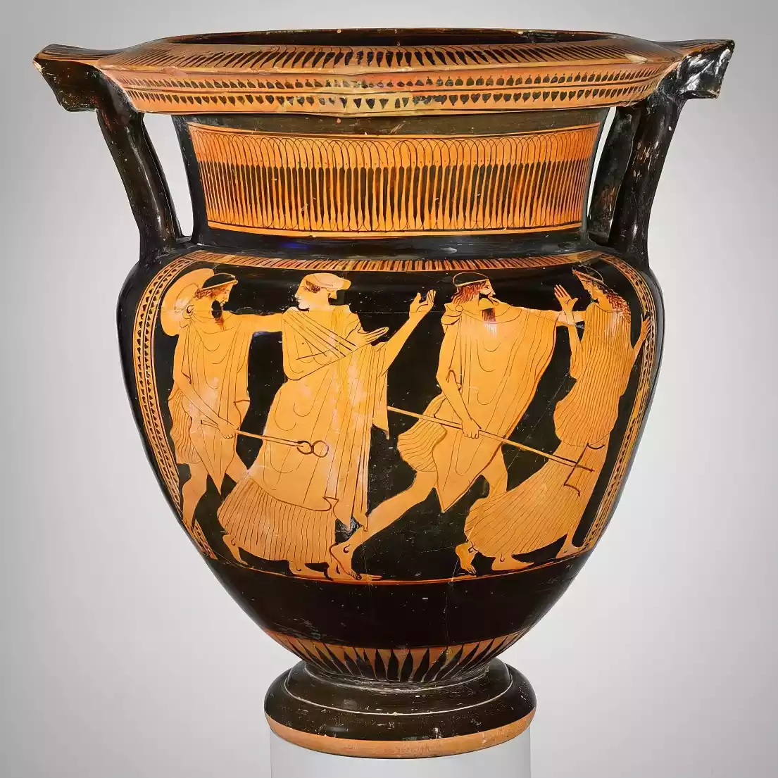 Cratere attico a colonna a figure rosse in terracotta, circa 460 a.C., attribuito al Pittore di Orione.