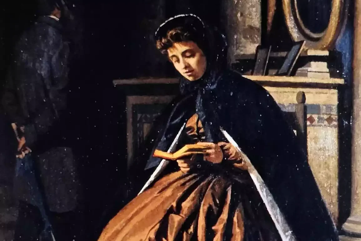 А что насчет этой женщины? Поза тела, вес платья — этот серый материал, который Аббати так тщательно изобразил в складках — кажется, почти ловит ее, как тяжелая бронзовая оболочка, а черная хламидия отделяет ее от окружения, кроме той яркой линии белой подкладки или лифа. Все это касается веса. Веса одежды, веса тишины, веса чтения в священном пространстве. Чтение, конечно, может быть некоторым побегом, но здесь это акт сосредоточения, почти труд. Книга маленькая, руки сжимают ее.