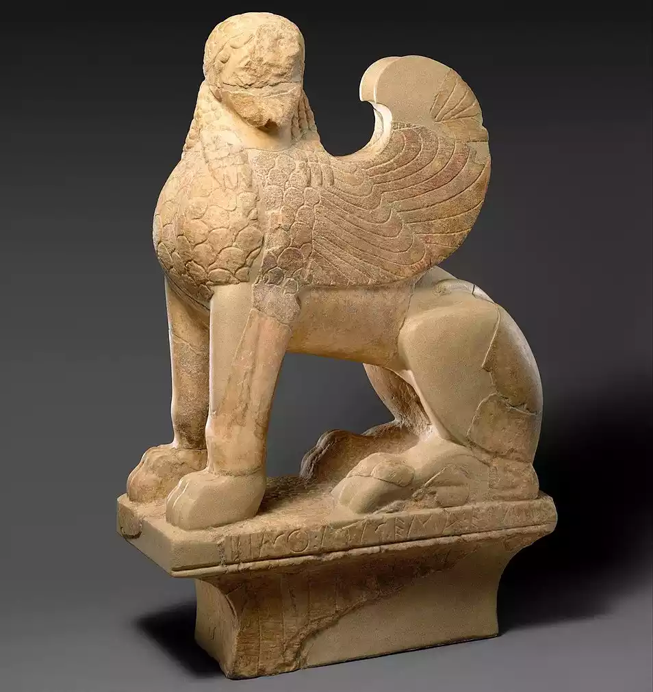 Αρχαϊκή Σφίγγα από πεντελικό μάρμαρο, περ. 570 π.Χ. Βρέθηκε στα Σπάτα Αττικής και αποτελούσε επίστεψη επιτύμβιας στήλης. Αθήνα, Εθνικό Αρχαιολογικό Μουσείο, αρ. 28.