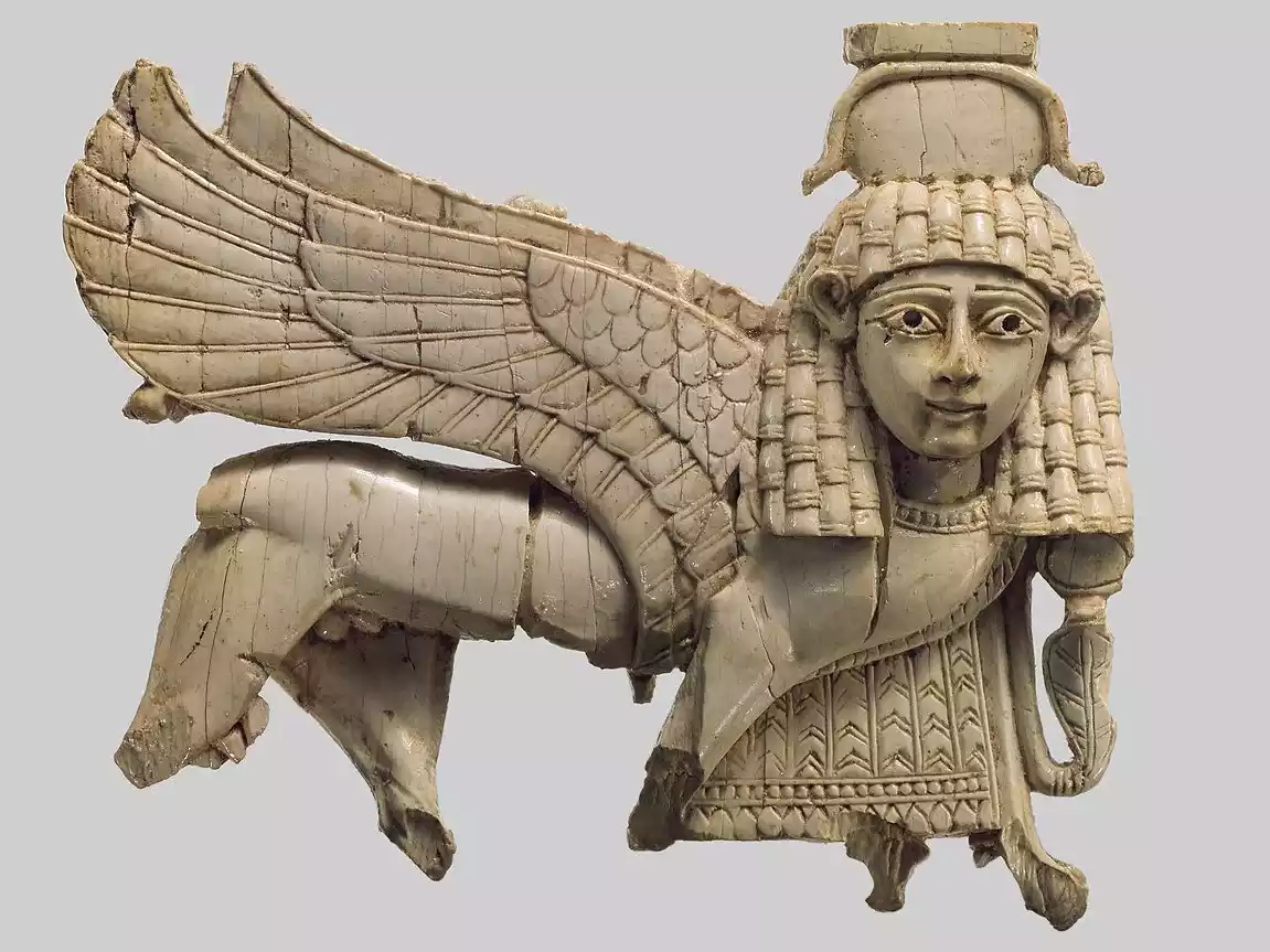 Διάτρητη πλάκα από ελεφαντόδοντο με βαδίζουσα Σφίγγα. Ασσυριακό έργο, περ. 9ος–8ος αι. π.Χ., δείγμα τέχνης της Αρχαίας Εγγύς Ανατολής. Νέα Υόρκη, Μητροπολιτικό Μουσείο Τέχνης, αρ. 64.37.1.